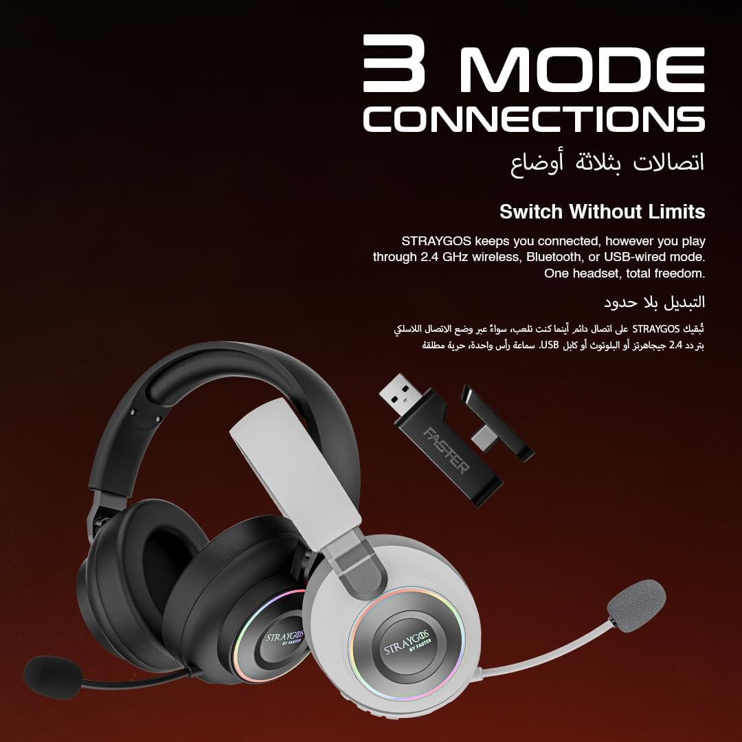 Level up your gaming experience with the FASTER BG600 STRAYGOS Wireless Gaming Headset, built for competitive play and immersive sound. Featuring tri-mode connectivity, switch seamlessly between 2.4GHz wireless, Bluetooth, and wired modes for maximum compatibility across PS5, PS4, PC, Xbox, and Nintendo Switch.