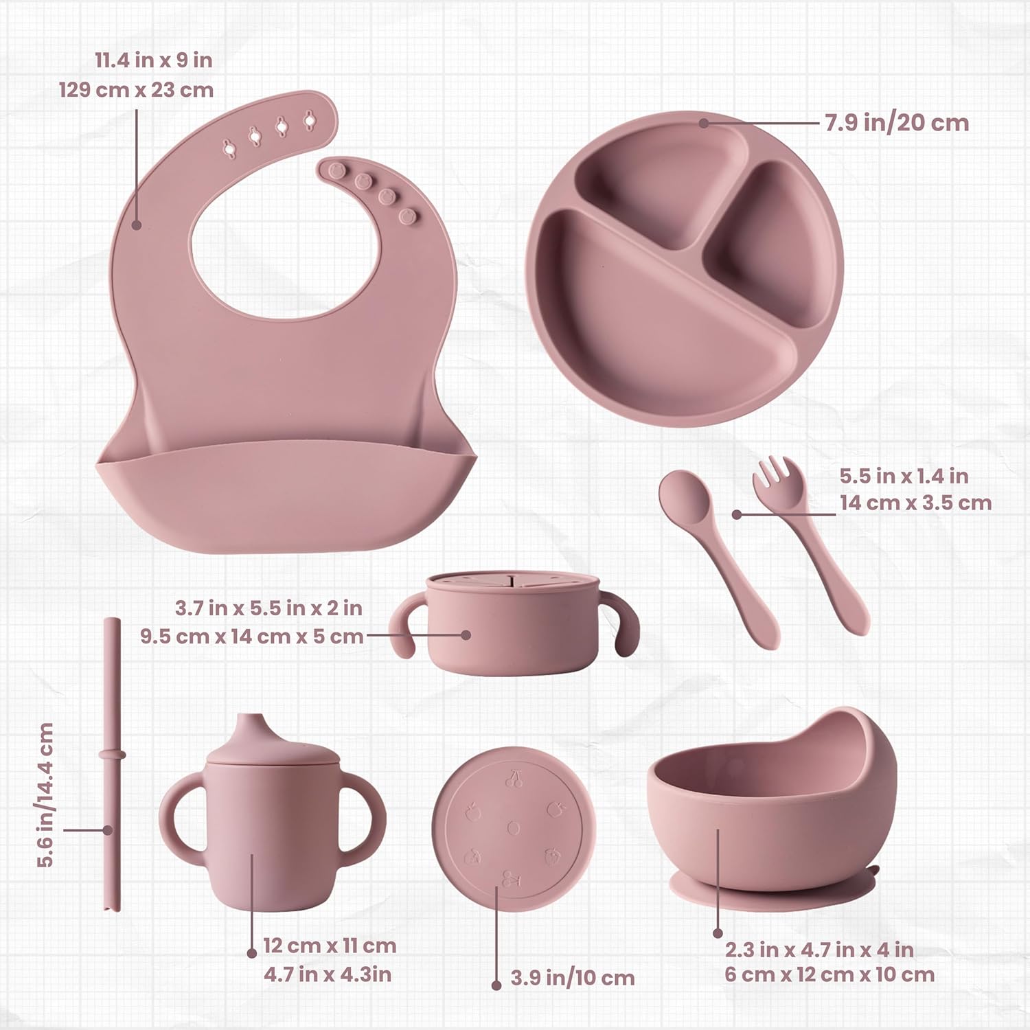 Premium 7-Piece Silicone Baby Feeding Set – Baby-Led Weaning Kit with Suction Plate & Bowl, Snack Cup, Straw Cup, Bib & Utensils | BPA-Free, Microwave & Dishwasher Safe | Pale Mauve